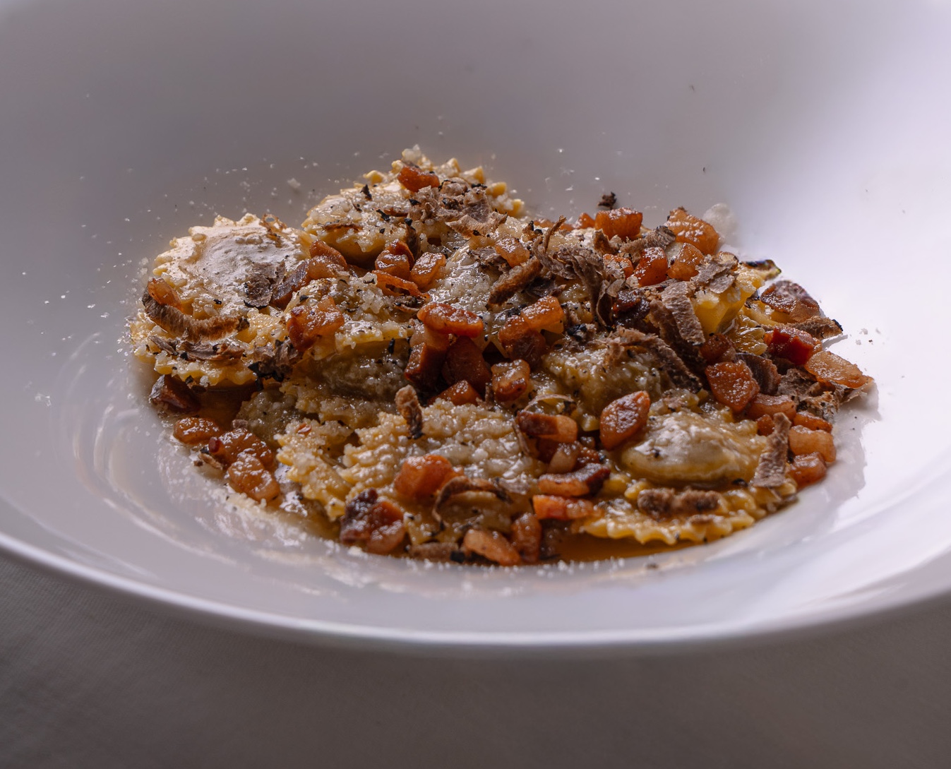 Tagliare la zucca a metà, togliere i semi e cuocerla in forno a 180 gradi finché non sarà cotta (circa 30 minuti). Affinché la polpa della zucca risulti asciutta, inserire una palla di carta stagnola nel forno in modo tale che lo sportello resti leggermente aperto e si favorisca l’uscita dell’umidità. Prelevare la polpa della zucca, passarla al setaccio e lasciarla raffreddare. Impastare farina e tuorli fino ad ottenere un composto omogeneo. Amalgamare alla purea di zucca il parmigiano, la pasta di nocciole, la polvere di nocciole, regolare di sale e pepe. Inserire in un sac à poche. Stendere la pasta il più sottile possibile, depositare una piccola quantità di ripieno, inumidire la pasta con acqua, coprire con un altro foglio di pasta. Avendo cura di fare uscire tutta l’aria e fare aderire la pasta al ripieno, sigillare gli anolini e forgiarli con l’apposito strumento. Sciogliere il burro con la salvia, finché il burro avrà raggiunto un color nocciola. Sobbollire in acqua salata per pochi istanti, colare delicatamente e saltare con il condimento preparato, servire con una generosa grattata di parmigiano e tartufo nero.