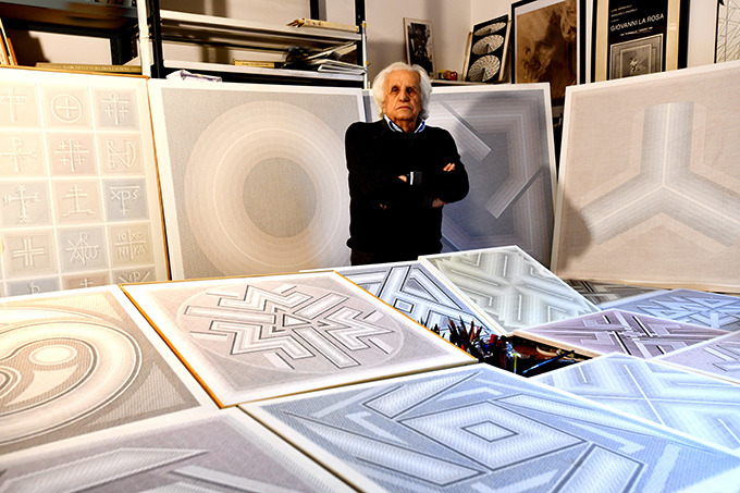 Della sua patria siciliana Giovanni La Rosa, nato nel 1936 a Caccamo, conserva tutti i ricordi dell’infanzia. Di un vivere semplice e genuino ma fatto di impegno, di una serietà che lo ha accompagnato da subito. Come l’amore per il disegno, verso il quale ha sentito, ancora giovanissimo, già negli studi scolastici elementari e ginnasiali inframmezzati dalla guerra, un trasporto superiore a ogni altro interesse. A ispirarlo, più che la campagna e il castello di Caccamo, sono state le piccole o grandi chiese, come il Duomo di Monreale. E ancor più che i mosaici e le preziose tessere, oggetto della sua attenzione erano le scritte, delle lettere e dei numeri, incise con stupefacente nitidezza. Il sole batteva un giorno forte e chiaro sui muri. E, ricorda ancora oggi, il suo sguardo di giovane allievo della Scuola d’Arte Palermitana correva con inaspettata meraviglia su quei levigati segni che univano tra loro, nell’incalzare dei giorni e della storia, grammatica e matematica: “Ho messo subito da parte, perché non era nei miei interessi, il richiamo della solita retorica del paesaggio mediterraneo, con le palme, gli agrumi, i colori forti e tutto quanto fa Sicilia. Mi incantavano invece la perfezione e la nitidezza di quelle lettere e di quei numeri. Sentivo che proprio lì c’era la storia, lì c’era il mistero antico, il senso della vita anche della mia terra che ti spinge a fare certe scelte piuttosto che altre. Quella è stata la mia”. Oggi Giovanni La Rosa si racconta nella casa dove ha portato il suo nuovo studio, dopo quello (di anni di lavoro) nel palazzo e nel cuore antico del Broletto di Varese. Sulla parete alle sue spalle piccole opere rimandano alle prime produzioni e fanno pensare alle minute preziosità narrative dei mosaici, dove segni, lettere e simbologie riportano a reminiscenze dell’arte più antica. Il lavoro di La Rosa, paziente e perfetto, è dono umile e insieme superbo di un artista e di un uomo giusto, che da sempre cerca il meglio. E che, mentre affonda dentro se stesso lo sguardo acuto, per avere conferme, consegna agli altri, in anni di impegno tra importanti mostre in Italia e all’estero, fondamentali lembi di verità. Da leggersi e conservarsi (attenzione) come codici preziosi.