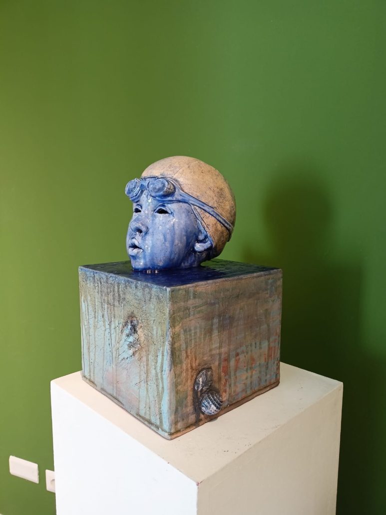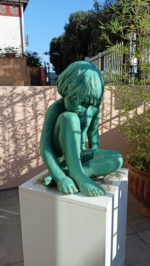 Si leggono, nel lavoro del bravo artista, consolazione e una promessa benefica: è il salutare desiderio di evasione, innocente come lo sguardo delle sue nuotatrici. Lo si scopre osservandone i visi, bellissimi sotto cuffie da bagno e occhialini colorati e la loro voglia di andare. In galleria sono in mostra altre tre opere scultoree di Garbolino. La stessa dolcezza di un viso di bimba si ritrova in “Grano Nuovo”, opera del 2020 dedicata alla figlia che gioca seduta sulla sabbia, in un morso di spiaggia che le corre attorno. “Il titolo – spiega il curatore – ci fa riflettere sulle nuove generazioni, che, proprio come il grano nuovo, sono l’avvenire”.