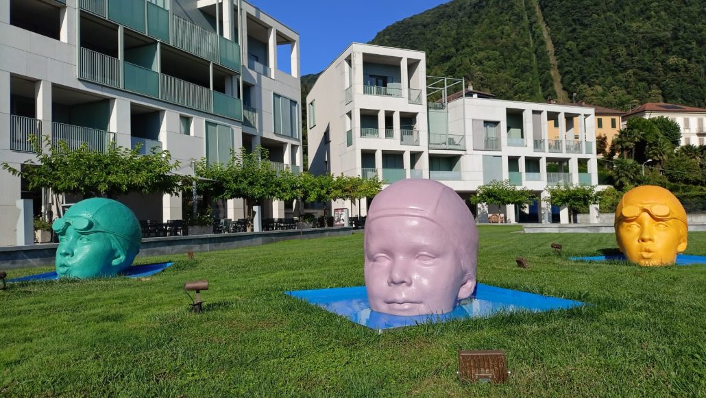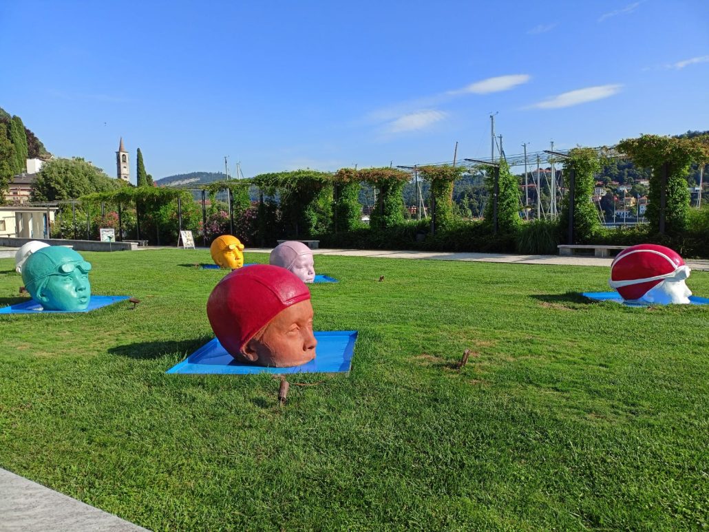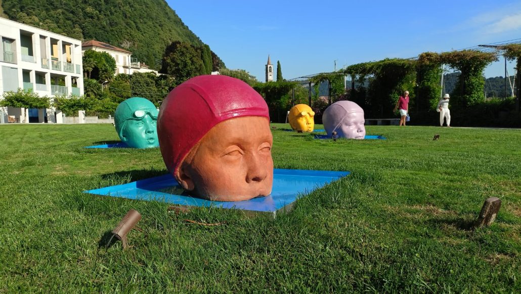 L’artista ha realizzato per Laveno 6 teste in marmo di nuotatori, 5 sono di giovanissime modelle (solo una è un autoritratto) immerse con le colorate cuffie nel verde del prato, come fosse una piscina color smeraldo vogliosa di sconfinare nel lago. Per chi osserva l’installazione l’effetto principale è, da subito, di avere sotto gli occhi una grande piscina animata da provetti nuotatori. Ma si potrebbe anche leggere il tutto come motivo di riflessione in un momento storico particolare, come quello che stiamo vivendo: forse persino richiamo a una voglia di lavacro (bagno ristoratore o purificatore), a una sete di vivere in acque pulite e, invece, non più rispettate dall’uomo. Rese torbide non solo dalla contaminazione irrispettosa di un mondo che non ama la natura, ma addirittura dal sangue dei sacrificati. Garbolino ha ricreato qui, nell’oasi verde di un prato fresco, la giocosa visione di un mondo altro, diverso, leggero, desideroso di nuovi spazi aperti e puliti sotto il cielo e sull’acqua.