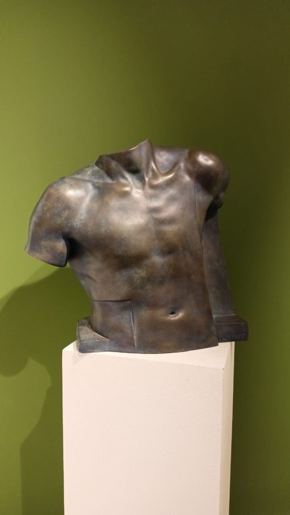 Una seconda opera di Garbolino, intitolata “Torso”, ci rivela invece “in un virtuosismo classico, la conoscenza anatomica dell’autore, veicolata attraverso materiali duri ed eterni come il bronzo”. Nello spazio della galleria è anche una recente testa di bimbo in ceramica dipinta, sempre di Garbolino, forse omaggio alla ceramica lavenese: che ripropone il tema e il titolo di OltreLago, ma in materiale e dimensioni diverse. E guarda alla grande ceramica di Andlovitz e di Antonia Campi. Molti grandi maestri sono stati qui, studiando e lavorando con passione, in questo spicchio di lago e di cielo. E varrebbe il viaggio, un altro viaggio nella bellezza, per sentirsi raccontare e conoscere le opere esposte al vicino Museo di Cerro Midec, a pochi chilometri di distanza nell’antica casa Perabò, dove la storia della ceramica lavenese, e non solo, è raccontata fin dalla nascita. Spiega il curatore Saporiti che è consuetudine della galleria richiedere di presentare un’opera in ceramica a chi espone qui: “Non solo perché siamo in una delle patrie della ceramica”, ma perché “la ceramica è storicamente la prima manifestazione di arte scultorea che conosciamo, dopo la scoperta del fuoco”.