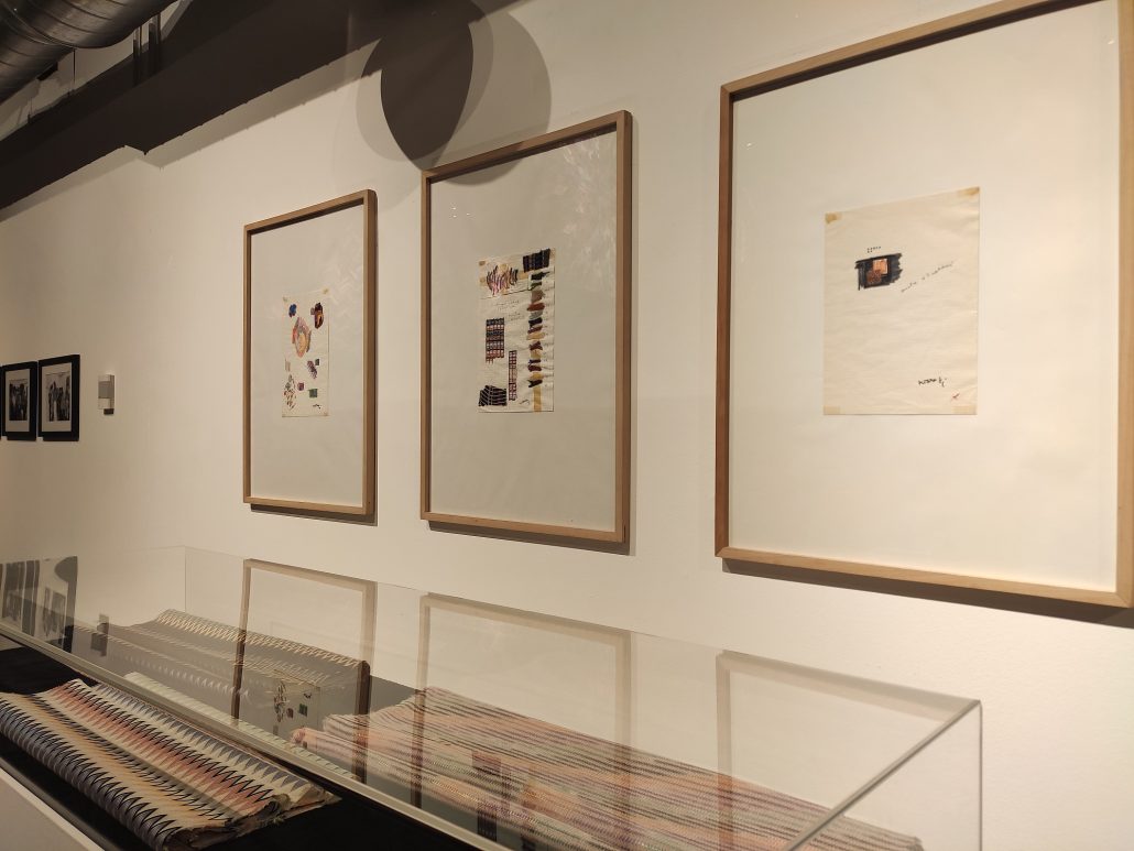 Chi conosce l’importante storia di Ottavio Missoni, brillante e armonioso sportivo nell’atletica, dove ebbe riconoscimenti a livello olimpionico, sa anche di questa sua tensione all’armonia dei colori. Espressa dagli accostamenti di matite e acquarelli, riscontrabili nei quaderni da lui usati, come rivela anche la mostra, allo scopo di studiare disegni e combinazioni cromatiche. Tenui trasparenze acquatiche si sposano nelle sue creazioni a decisi violetti o sfidano la luminosità dei gialli, che contrastano in allegria l’azzurro più azzurro. Ma anche il bianco e il nero oppure le diverse tonalità dei beige e dei marroni, incrociano tra loro eleganti danze di alti e bassi, di giri concentrici e virate geometriche. Oppure capita al maestro di sfogare gioia e voglia di vivere nei rossi accesi come papaveri o nei verdi fluorescenti. In quei tratti, in quei colori, Ottavio imprigionava e custodiva, come pepite d’oro, momenti indimenticabili di una vita diversa dalle altre. Dove buona e sfavorevole sorte, necessità e vento in poppa avevano accompagnato il suo viaggio di uomo a partire dagli anni migliori della vita, quando la giovinezza incanta e invita a sperare. A lui, come ad altri, era però toccato di lasciare la Dalmazia, il suo cielo e il suo mare. E venire in Italia. Ma frutti dolci erano in serbo. E lui aveva saputo coglierli. E moltiplicarli, in quel viaggio tra terra e terra di un unico, colorato mondo intessuto di trame sottili. Dove affioravano cieli e paesaggi e nuvole in corsa, terre brulle sotto scarnite radici di alberi e foglie sfibrate nel vento. In Italia aveva ritrovato il mare e la voglia di vivere. E di mettersi a creare con le proprie mani.