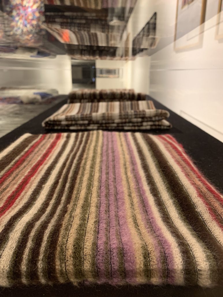 Non è una sala qualunque. È un tempio aperto a tutti. Accoglie nella penombra e invita al raccoglimento, nel silenzio dato dal procedere ovattato, tra arazzi patchwork, posati ovunque, che catturano gli occhi e il cuore. Perché la prevalenza dei colori fa pensare a un mondo diverso e agli artisti che più ci sono sicuramente piaciuti nei nostri incontri museali: Klimt, Kandinsky, Mirò, sono anche loro qui. Tra quei fili, quei motivi geometrici in cui ci si annega, senza pensieri, abbandonati a trame celesti, azzurre e violette, scarlatte o dorate oppure trasparenti come le acque marine. Fondatore nel 1953, con la moglie Rosita Jelmini, di una tra le più importanti maison italiane, Ottavio ha saputo far fiorire l’attività della impresa di Sumirago grazie anche alla sua predisposizione per l’arte. Fantasia cromatica e sensibilità artistica si sono poi incrociate alle conoscenze tecniche via via acquisite e alla lungimiranza imprenditoriale di un’intera famiglia, compresi i figli Vittorio, Luca e Angela.