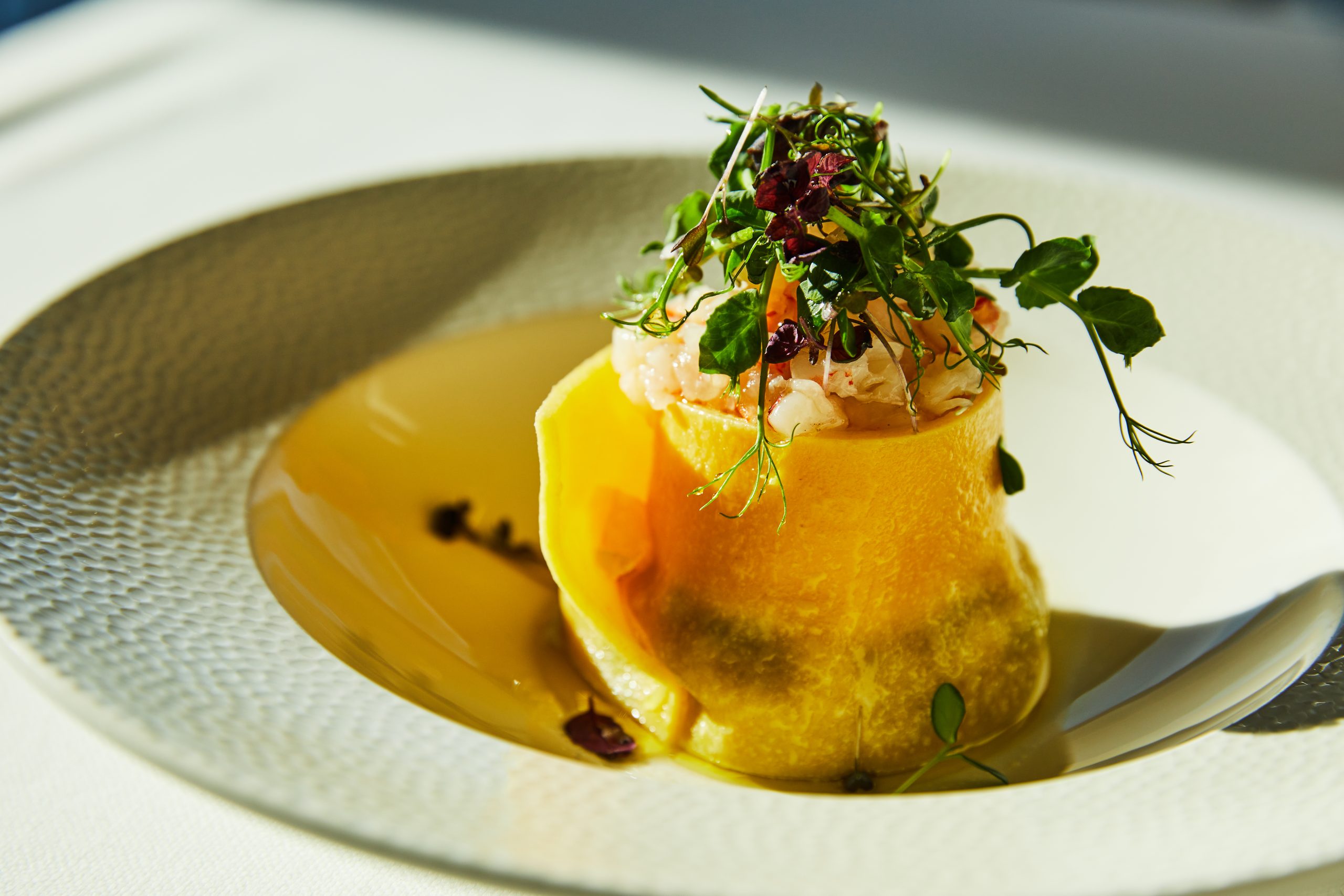 Tagliatella ripiena di luccioperca e ricotta con gamberi e germogli, abbinata al vino L’Eroica: un piatto scenografico firmato Chef Fortinelli