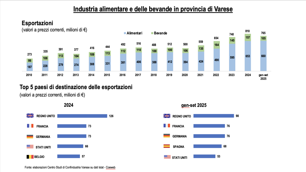 L’agricoltura locale è tipica dell’area prealpina, legata alla fascia collinare e montana: mais, erbe foraggere e officinali, castagne, uva, qualche frutto come le pesche. Ne derivano piatti solidi, spartani, pragmatici. Piatti che, in fondo, riflettono il nostro stesso carattere. Eppure, nonostante questa sobrietà, nel tempo il territorio ha saputo sviluppare un settore di trasformazione alimentare e delle bevande di assoluto rilievo, dinamico e in crescita. I numeri, in questo senso, riservano sorprese tutt’altro che trascurabili. Pochi sanno, ad esempio, che l’export del settore alimentare varesino vale circa 800 milioni di euro e che, in alcuni periodi recenti, ha addirittura superato per valore quello della gomma-plastica. O che Varese si colloca al 24esimo posto tra le province italiane per export del comparto.