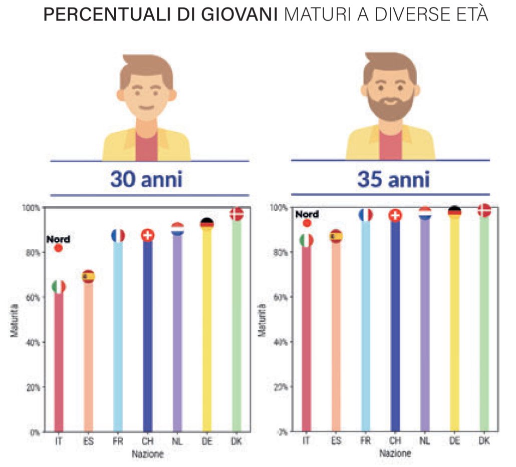 E il risultato è netto. L’Italia rispetto al resto d’Europa è indietro. Non una novità, ma i numeri chiariscono ancora meglio i contorni di un problema che diventa emergenza. Secondo i ricercatori della LIUC, all’età di 30 anni solo poco più del 60% dei giovani può dirsi pienamente maturo sui tre aspetti di misurazione presi in considerazione: l’aspetto economico, ovviamente, ma anche quello delle normative che dovrebbero tutelare o garantire l’ambizione all’autonomia dei singoli e quello delle relazioni che la persona è stata in grado di crearsi. Tutti gli altri Paesi europei presi a confronto fanno meglio di noi. In Danimarca a 30 anni la maturità è ormai raggiunta da quasi tutti i ragazzi e le ragazze. In Francia, Svizzera, Germania e Olanda la quota di autonomi è superiore all’80%. Più bassa in graduatoria si piazza la Spagna che fa, comunque, meglio di noi.